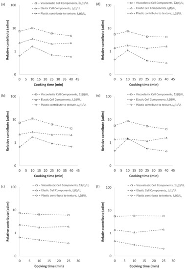 As it can be argued from figure, the three rheological parameters changes with the time of heating according to synchronous trends, suggesting that the two varieties of cauliflower are characterized by a tissue microstructure having the same microstructure hierarchy and polymer interactions at a cellular scale. Data also confirm that the relative contribution of cell elements to the overall creep compliance followed a decreasing order among viscoelastic, elastic and plastic supramolecular assemblies, either in the absence of the heat and after heating. As a consequence, the non-covalent network among cellulose, hemicellulose and pectin assemblies can be recognized as the most compliant and heat-sensitive cell element, irrespectively of the cauliflower variety and heating technology. In other words, the interconnections inside cellulose, hemicellulose and pectin assemblies represent the key scale level on which texture softening and tissue decompartmentalization are mainly depending on a microscopic scale.