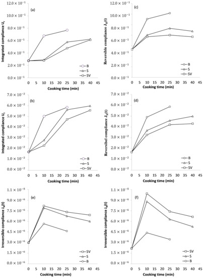 Softening kinetics as described by the integrated compliance Ur(t) (a,b) as well as of the reversible JR(t) (c,d) and irreversible JN(t) (e,f) components of the compliance under boiling (B), steaming (S), and sous-vide (SV) for Depurple (left) and Cheddar (right) cauliflower.