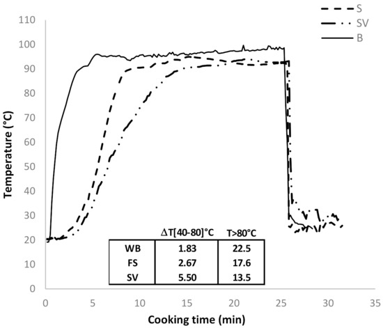 Because direct steamed and sous-vide steamed samples were characterized by an equivalent strain energy release (intermediate between boiled and untreated samples) and at the same time by different stiffness levels, it is suggested that the different cooking methods may induce the same extent of softening on a macroscopic scale through two independent disassembling mechanisms that occur on a microscopic scale, i.e., cell wall separation and cell wall rupture. Changes in rheological properties in the range of large-scale deformation, reported in Figure 1 and Figure 2, were also compared to the corresponding temperature profiles experienced by the samples under heating.