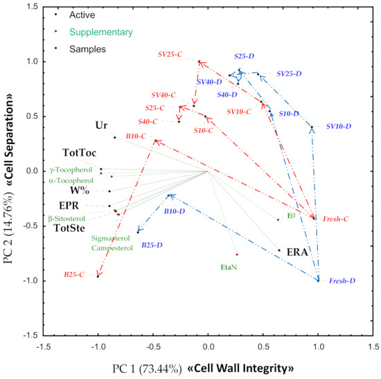 The score loadings corresponding to the samples treated under the same cooking technology were also connected with consecutive arrows to trace the pattern of microstructural changes during heating (from 0 to 40 min). As can be argued from figure, the pattern of changes was similar under the same cooking technology, but satisfactorily discriminated the samples belonging to Depurple variety from those belonging to the Cheddar one. The first three principal components explained more than 93% of the experimental variance (73.44%, 14.76%, and 11.8%, respectively). The ERA parameter was positively correlated to E0 and opposite to EPR and Ur. EPR was also opposite to Ur and EtaN. Such relationships corroborated the idea that the covalent bonds (as indicated by E0) are positively linked to both the turgor pressure and cell wall integrity (as indicated by ERA), and that cell separation (as indicated by low levels of EPR) is the main cause of softening (as expressed in terms of Ur) resulting in a decrease of non-covalent bonds (as indicated by low levels in EtaN). According to the magnitude and signs of the factor coordinates of the two microstructural-related parameters ERA and EPR, the first two principal components (PC 1 and PC 2) were meaningfully labeled as to “Cell Wall Integrity” and “Cell Separation”, respectively. Magnitude and signs of the factor coordinates also indicated that TotToc, TotSte, and W% were positively correlated to EPR and Ur as well as that they were negatively correlated to ERA. Such results provided compelling evidence that the extractability of sterols and tocopherols was in agreement with the loss of cell wall integrity (as described by ERA) and that it was in Cheddar cauliflower higher than in Depurple. The extractability of the phytochemicals increases with the time of heating to such an extent depending on the ability of the cooking technology to enhance cell wall loosening to a greater extent with respect to the viscous flow in the middle lamella through cell separation, thus achieving low levels of ERA and high levels of EPR.