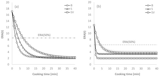 Tissue decompartmentalization kinetics of Depurple (a) and Cheddar (b) cauliflower under boiling (B), steaming (S), and sous-vide (SV) as described by the ERA parameter (intended as an indirect measure of the loss of cell wall integrity and of the easy of extractability of sterols and tocopherols).