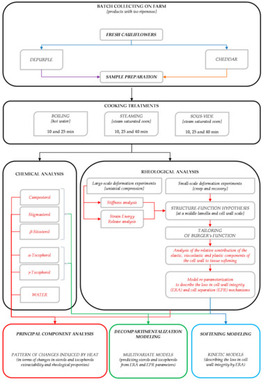 The effects of the heat in both cauliflower varieties, Cheddar and Depurple, were evaluated under boiling (B), steaming (S) and sous-vide (SV) in terms of texture softening, tissue decompartmentalization kinetics and sterols and tocopherols extractability, using large- and small-scale deformations properties as structure-related descriptors on a macroscopic and microscopic scale, respectively.