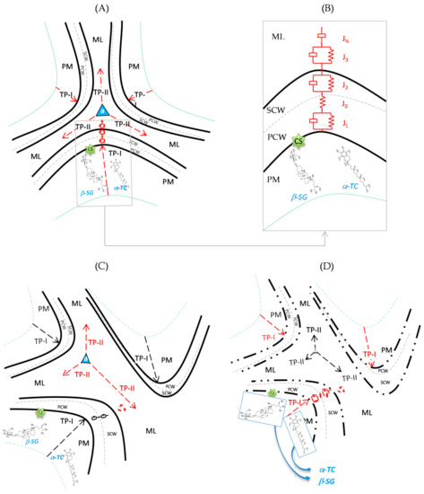 Biophysics underlying softening and decompartmentalization as induced by heat. At the equilibrium, the mechanical stress induced by cell turgor is distributed at tricellular junctions joining the parenchymatic cells with two stress components: the first component acting at cell wall level on the plane of each cell-to-cell contact, and the second component acting at middle lamella level as radial stress separating the cells at the tricellular joining corners (A). Polymer assemblies contribute to counter balance turgor by stressing effectively their elastic, viscoelastic and plastic elements from middle lamella to primary and secondary cell wall microdomains (B). Heating causes partial disassembling of plasma membrane (reducing turgor) and pectin degradation, mainly through enzymatic and chemical reactions. When pectin degradation is limited in the middle lamella microdomain, the survivor second stress component of turgor will be able to separate the cells without rupture of their walls, with sterols and tocopherols remaining entrapped by the integer walls (C). When pectin degradation extends from middle lamella to primary and secondary cell wall, the survivor first stress component of turgor will be able to cause wall loosening (or partial rupture) and effective decompartmentalization of sterols and tocopherols (D). TP-I, turgor pressure I component; TP-II, turgor pressure II component; PCW, primary cell wall; SCW, secondary cell wall; PM, plasma membrane; ML, middle lamella; CS, cellulose synthase; β-SG, glucoside of β-Sitosterol; α-TC, α-Tocopherol.