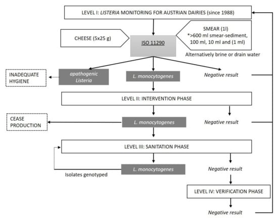 Zangerl, P.; Schoder, D.; Eliskases-Lechner, F.; Zangana, A.; Frohner, E.; Stessl, B.; Wagner, M. Monitoring by a Sensitive Liquid-Based Sampling Strategy Reveals a Considerable Reduction of Listeria monocytogenes in Smeared Cheese Production over 10 Years of Testing in Austria. Foods 2021, 10, 1977. https://doi.org/10.3390/foods10091977