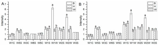 Electronic nose detection, with good reproducibility and repeatability, is a simple, quick, non-destructive, and specific technique. Electronic nose is adopted for measuring the volatile fingerprint based on the time responses of sensor arrays but could not identify flavor compounds as precisely as GC-MS []. Electronic nose could detect the characteristic differences in the flavor profiles in yolks and albumen. As shown in Figure 1, the values of electronic nose histogram were on behalf of the average signal variation for every sensor. For egg yolks in Figure 1A, sensors W1W, W2W, W1S, W2S, and W5S displayed higher values than the rest of the sensors, with W1W of B eggs exhibiting the highest value. This indicated that these five sensors had larger proportions in egg yolk tastes. It was clear that eight sensors, all except for W6S and W3S, had significant differences in egg yolks from three breeds (p < 0.05). For egg albumen in Figure 1B, sensors W1W, W2W, W1S, W2S, and W5S also exhibited higher values than the rest, with W1W of B eggs getting the highest value. Egg albumen had the same taste characteristics as egg yolks. All 10 sensors had differences in egg albumen from three breeds (p < 0.05). According to above results, W1W, sensitive to sulfur compounds; W2W, sensitive to aromatic, sulfur organic; W1S, sensitive to methane; W2S, sensitive to alcohol, aromatic; and W5S, sensitive to nitrogen oxides, were the main flavor components of egg yolks and albumen from the three breeds. The most volatile compounds measured by electronic nose showed significant differences in egg yolks and albumen from three breeds, in which sulfur and aromatic compounds of B egg yolks and albumen shown in W1W and W2W had more obvious spikes than H and W yolks and albumen (p < 0.05).