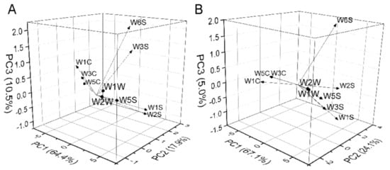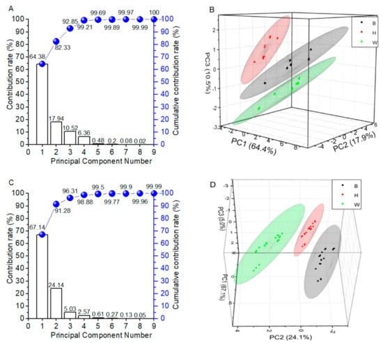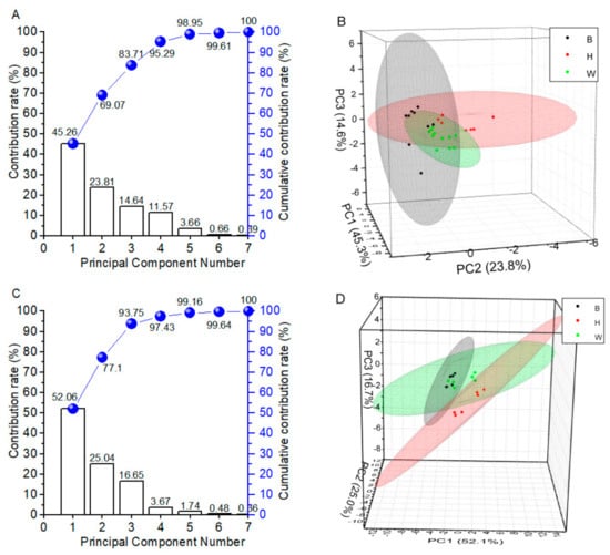 PCA was used to reduce dimensionality with a minimum loss of information, transform the original variable data, and eliminate the overlapping parts in the coexistence of a great deal of information []. PCA could present the distinction among three breeds’ eggs and indicate the relative importance of sensors in explaining the variance of breeds. It is often found that the first few principal components account for most of the information present in the original data set. For yolks in Figure 2A, the contribution rate of the first principal component (PC1), the second principal component (PC2), and the third principal component (PC3) were 64.4%, 17.9%, and 10.5%, respectively. The total accumulative contribution rate of PC1, PC2, and PC3 reached 92.8%, which proved that PC1, PC2, and PC3 could be used as representatives for subsequent analysis. As displayed in Figure 2B, it was clear that egg yolks from three breeds were clearly separated from each other by PCA. For albumen in Figure 2C, the total variance explained by the PCA was 96.3%, where PC1, PC2, and PC3 explained 67.1%, 24.1%, and 5.0%, respectively. A good separation of B, H, and W albumen was also obtained. PCA projects the data onto fewer dimensions and hence was chosen to exploit the relationships between the variables. PCA is an unsupervised method for grouping egg yolks and albumen from the three breeds based on the inherent similarity or dissimilarity of their chemical information without prior knowledge of egg breeds. The PCA was reported to discriminate different storage time, as the freshness quality was based on electronic nose data [].