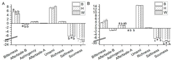 Electronic tongue mimics the human tongue and obtains five tastes, including astringency, bitterness, sourness, saltiness, and umami by five sensors []. Sensor AE1 evaluates astringency and aftertaste-astringency (aftertaste-A), sensor C00 tests bitterness and aftertaste-bitterness (aftertaste-B), sensor AAE measures umami and its richness, and sensors CT0 and CA0 were for saltiness and sourness, respectively. The tasteless value was −13 for sourness, −6 for saltiness, and 0 for other tastes caused by reference solutions (potassium chloride and tartaric acid). As shown in Figure 4, the sourness taste, whose value was less than the tasteless value of −13 in egg yolks and albumen from three breeds, was not included in the following analyses. For egg yolks in Figure 4A, H yolks had lower values in bitterness and higher values in saltiness than B yolks (p < 0.05). The aftertaste-B of egg yolk was not in discussion, with a value less than zero. For egg albumen in Figure 4B, H albumen had lower values in astringency and higher values in saltiness than B albumen (p < 0.05). The aftertaste-A value was also less than zero and not in discussion as sourness. Because saltiness values were almost −6, the main different tastes among three breeds of eggs were bitterness for egg yolks and astringency for egg albumen.