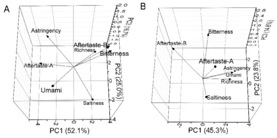 As illustrated in Figure 6 and Table 6, the astringency taste had the highest load coefficient of 0.54 in PC1, which indicates that the astringency had the main positive contribution for egg yolks. The load coefficient of bitterness was the highest value of 0.66 in PC2. The aftertaste-A had the highest load coefficient of 0.54 in PC3. For egg albumen, the load coefficient of bitterness had the highest absolute value, which indicates that aftertaste-A had the main negative contribution in PC1. In PC2 and PC3, the astringency and bitterness had the highest load coefficient. In all, astringency, aftertaste-A, and bitterness dominated the major contributions to taste profiles for egg yolks and bitterness for egg albumen.