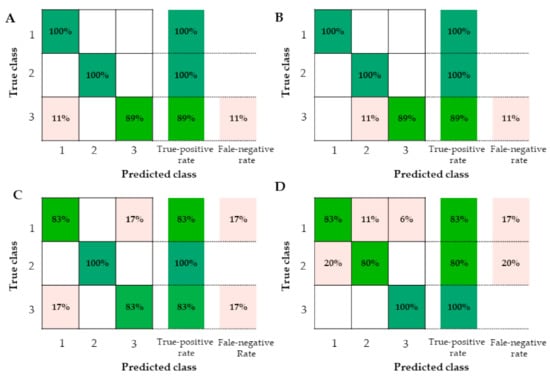 Confusion matrix of electronic tongue for yolks, albumen, and eggs by classification algorithms. (A) Confusion matrix for yolks by linear discriminant analysis (LDA). (B) Confusion matrix for yolks by fine tree. (C) Confusion matrix for albumen by linear discriminant analysis (LDA). (D) Confusion matrix for whole eggs by fine K-nearest neighbor (KNN). Number 1, Wuhei (W); Number 2, Beinong No.2 (B); Number 3, Hy-Line Brown (H).