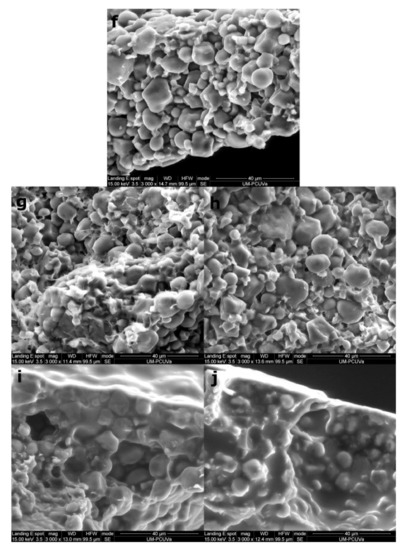 Micrographs of crust cross-section at 3000× magnification. Images correspond to breads supplemented with 10% protein and control sample: Control (50% rice flour: 50% maize starch) (f), Rice protein 10% (g), Pea protein 10% (h), Egg white powder 10% (i), Whey protein 10% (j) [14].