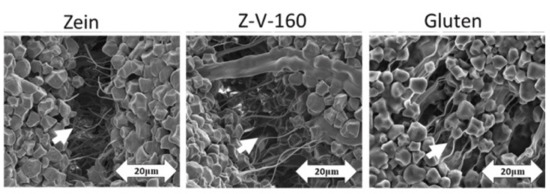 In addition, the extraction procedure, as well as a treatment performed on the protein source, could affect the properties of proteins that are of great importance for the dough behaviour and final bread quality. Zein’s limited ability to improve dough extensibility was surpassed by applying thermal treatment [16] and extrusion [17]. These treatments improved the gluten-free dough structure. In Figure 2, one can visualize the microstructure of the dough during extension [16]. Dough samples with rice starch and untreated zein showed a higher number of broken fibrous linkages during stretching that was not observed in thermally treated zein at 160 °C (Z-V-160) or in samples with added wheat gluten, as indicated by white arrows. This suggests that thermally treated zein was able to create a more similar structure to gluten compared to the untreated one, and the thermal treatment could further improve the quality of bread.
