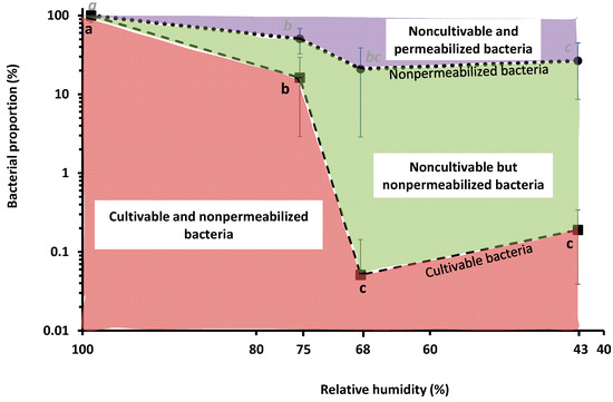 Impact of drying in PBS on L. monocytogenes EGDe cultivability and plasma membrane permeability. Bacteria were dried at 75%, 68% or 43% RH for 3 h at 25 °C, then instantaneously rehydrated in PBS. Undried bacteria were maintained at 99% RH (control). (- - -) represents the proportion of cultivable bacteria and (• • •) the proportion of nonpermeabilized bacteria. The proportion of cultivable bacteria was estimated using the CFU counting method, the proportion of nonpermeabilized bacteria was estimated by labelling cells with PI and using a flow cytometer. Letters indicate significant differences (p < 0.05) based on Tukey post hoc tests. Two independent Tukey tests were run: one for cultivability measurement (black letters) and another for nonpermeabilized bacteria counting (italics grey letters).
