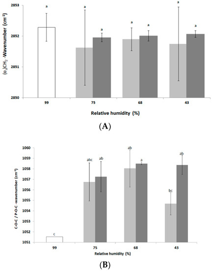 FTIR transmission spectroscopic analysis of L. monocytogenes EGDe components after dehydration. Cells were dehydrated at 25 °C and 75%, 68% or 43% RH for 3 h (light grey bars) or 16 h (dark grey bars) and then instantaneously rehydrated in PBS. Untreated cells (control, white bars) were maintained at 99% RH. FTIR spectroscopic analysis was performed on the second derivative spectra as explained in the Materials and Methods section. Changes in frequency of (A) symmetrical (υs)CH2 and (B) C–O–C/P–O–C peaks. Error bars correspond to the standard deviation calculated from at least three independent experiments (except for control in (B) for which only one repetition could be run). Histogram bars followed by different letters indicate significant differences (p < 0.05) as determined by the Tukey post hoc test.