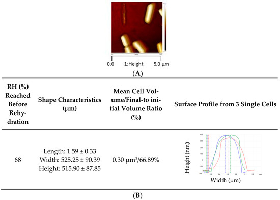 L. monocytogenes EGDe morphology observed by AFM after dehydration and rapid rehydration in PBS. Cells were dehydrated in PBS at 68% RH for 3 h at 25 °C. AFM height images (with a Z-scale approx. 250 nm) of cells dehydrated at (A) 68% RH followed by rapid rehydration. (B) L. monocytogenes EGDe morphology characteristics. Cells were immobilized on a glass slide coated with poly-d-lysine.