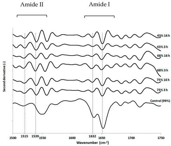 FTIR transmission spectroscopic analysis of L. monocytogenes EGDe components after dehydration. Cells were dehydrated at 25 °C and 75%, 68% or 43% RH for 3 h or 16 h and then instantaneously rehydrated in PBS. Untreated cells (control) were maintained at 99% RH. FTIR spectroscopic analysis was performed on the second derivative spectra, as explained in the Materials and Methods section. Randomly selected second derivative spectra ranging from 1500 cm−1–1750 cm−1 in the Amide I and Amide II regions are presented.