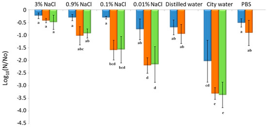 The decreased cultivability of L. monocytogenes strain EGDe dehydrated at 25 °C and 75% RH for 3 h and rehydrated in various liquid matrices. The bacteria were suspended and then dried in different solutions: 3% NaCl (0.989 aw), 0.9% NaCl (0.997 aw), 0.1% NaCl (0.999 aw), 0.01% NaCl (0.999 aw), distilled water (1.000 aw), city water (1.000 aw) and PBS (1.000 aw). Subsequently, rapid rehydration was performed in (■) PBS, (■) distilled water or (■) the same liquid matrix used for dehydration. Error bars correspond to the standard deviation calculated from four independently repeated experiments. Histogram bars followed by different letters indicate significant differences (p < 0.05) determined by Tukey post hoc tests.