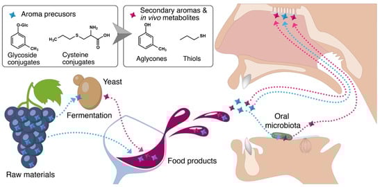 Flavor is one of the most relevant attributes determining food quality and acceptance by consumers. Odor and taste in fermented products, such as wine and beer, are determined to a large extent by the action of microorganisms either involved in the fermentation process or present in the oral cavity. One of the most noteworthy mechanisms of aroma generation is the metabolization of precursors through the action of microbial enzymes. This occurs in the product as well as the oral cavity during chewing/drinking and can be carried out by different enzymes, such as glycosidases or carbon–sulfur lyases (Figure 1) [,,]. In the following lines, we present two main categories of such precursors, namely glycoside conjugates and cysteine conjugates.
