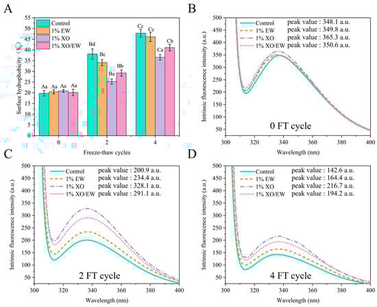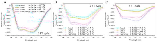 Zhang, Z.; Xiong, Z.; Walayat, N.; Lorenzo, J.M.; Nawaz, A.; Xiong, H. Effects of the Mixture of Xylooligosaccharides and Egg White Protein on the Physicochemical Properties, Conformation, and Gel-Forming Ability of Culter alburnus Myofibrillar Protein during Multiple Freeze–Thaw Cycles. Foods 2021, 10, 2007. https://doi.org/10.3390/foods10092007