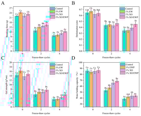 | 1% XO/EW | 52.81 ± 3.94 Ab | 4.92 ± 0.28 Db | 11.45 ± 0.63 Bb | 4.72 ± 0.02 Dd | 0.0812 ± 0.0085 Bbc | |