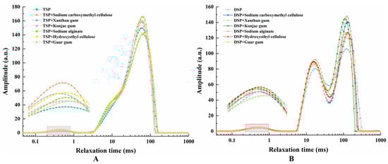 In 3D printing, the smooth extrusion of ink is the first condition for successful printing. It is closely related to its moisture distribution, and studies have shown that the relaxation exponent can also be used to judge whether the ink can be printed [32,33]. In LF-NMR analysis, the smaller magnitude of the transverse relaxation time (T2) proves the water closely bound to other non-aqueous components was low. In contrast, a large transverse relaxation time shows less closely bound water with the non-aqueous components in the sample with a higher degree of freedom of water [34]. As shown in Figure 1, inks composed of different proteins and hydrocolloids generally had three peaks: the T21 peak of the bound water with the relaxation time in the range of 0.1–10 ms, the T22 peak of the semi-bound water with the relaxation time in the range of 10–100 ms, and the T23 peak of the free water with the relaxation time in the range of 100–1000 ms [35]. It can be observed from Figure 1 that the water distribution in TSP and DSP inks was obviously different, but the water distribution trend of the same protein remained the same no matter what kind of hydrocolloid was added. It was found that although the hydrocolloid in the ink is also an important factor affecting the ink moisture distribution, its influence is weaker than that of the protein species. In other words, the use of a suitable protein ink matrix is the most important in this work. Because the relative degree of binding water in DSP ink was small, and the relative degree of free water was large, DSP inks had higher fluidity, so most of the samples printed by this ink showed poor self-supporting properties and printing accuracy. In fact, an excessive liquid property in printing inks has proven to be unsuitable for printing, due to its reduced printing geometric accuracy and self-supporting properties [36]. In Figure 1B, the T22 and T23 peaks of DSP without hydrocolloid were lower than those of ink with any hydrocolloid, which indicated that the water content of DSP ink without hydrocolloid was very little. Most of the water existed in a state that was not bound to the protein, which explains the phenomenon that DSP inks were only squeezed out of unbound water when printing. Combined with the printing results of DSP inks and the results of water distribution analyzed by LF-NMR, we can conclude that DSP inks are not suitable for printing in this work.