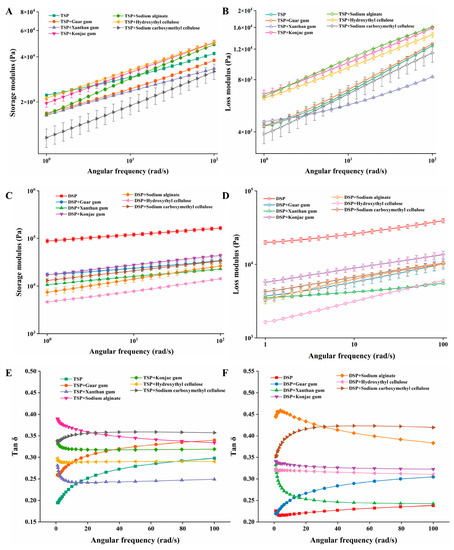 The rheological properties of different inks. (A,C) G′ of composite TSP and DSP inks added with different hydrocolloids. (B,D) G″ of composite TSP and DSP inks added with different hydrocolloids. (E,F) Tan δ of composite TSP and DSP inks added with different hydrocolloids.