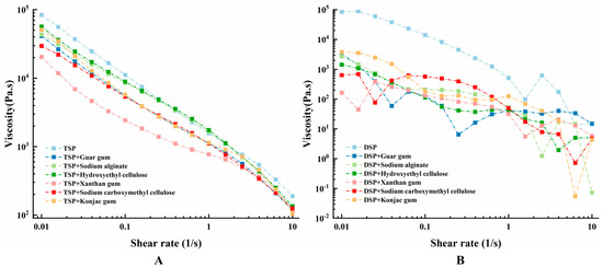 Viscosity curve of composite inks. (A) TSP with different hydrocolloids. (B) DSP with different hydrocolloids.
