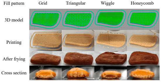 The taste of food is a parameter that consumers give great importance; thus, it has a great impact on food’s acceptance by consumers. TPA analysis was used to evaluate the hardness, chewiness, and viscosity of samples [46]. The hardness of the sample reflects the force exerted by the compression of the sample to produce constant deformation, while adhesiveness refers to the force exerted from instability to stability of the semi-solid sample, which can characterize the chewiness of the sample and the acceptability of consumers [47]. Figure 4 shows the samples of different infilling patterns (grid, triangle, wiggle, honeycomb) when printing and during frying. The samples could be printed out completely with good printing characteristics in all infilling patterns and can retain their shape during the frying process. The cross-sectional view of the sample in Figure 4 shows that the internal structure of the sample differs for different infilling patterns. Except for the triangular infilling pattern which can effectively connect the interior and surface of the sample, different voids are formed on the surface and interior of the sample for other infilling methods. Table 5 presents the texture test results of samples with different infilling patterns. Control 1 was a purchased fried chicken product and control 2 was made from a model without 3D printing. It can be seen from the table that there were significant differences (p < 0.05) in hardness, springiness, chewiness, and gumminess between the 3D printed and purchased samples and the non-3D printed samples. There were also significant differences in texture properties between different infill patterns, which may be due to the different internal porosity of different infill patterns, and the action of force to break was also different [48]. Moreover, it can be observed from Table 5 that there was no significant difference (p > 0.05) in hardness, gumminess, and chewiness between the samples with triangular infill pattern and the target sample.