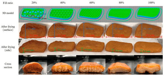 In printing, different infilling patterns and ratios can affect the printing accuracy and texture characteristics of 3D printed objects. Figure 5 presents 3D patterns with different infilling ratios (triangular filling) and fried samples. From this figure, it can be observed that the samples with too low infilling ratios (20%) ruptured on the surface and a partial bulge formed during deep-frying, which was also the reason for the largest change in the height of the sample. The rupture degree of 20% infilling samples was greater than other infilling samples, which may be since the low infilling ratio will have a larger gap; thus, more oil enters the sample. From the cross-sectional view of the sample in Figure 5, it can be found that as the filling ratio increases, the inner grid structure becomes denser. The internal grid structure of the sample filled with 20% is destroyed after frying and cannot maintain the shape before frying. This is because the low infilling rate makes the sample contact with more oil during frying and more thoroughly evaporates the water in the sample. This causes the mesh that originally connected the epidermis to break and eventually form a bulge. Samples with a larger infilling ratio can be preserved without destroying the internal grid structure after frying. However, at high infilling ratios (80% or 100%), although the internal grid structure still exists, the inside of the sample cannot be properly fried due to the excessive infilling and still has a high moisture content. This will cause the interaction force between the internal grid structure of the sample to become smaller, and the fried sample will have a smaller hardness. As the contact surface of water and oil increases, the evaporation of moisture becomes more intense, leading to surface rupture of the samples. The moisture measurement results in Table 6 also show that the moisture content of the 20% infilling after deep frying is significantly lower than the other groups, only 1.95%. When the infilling rate was above 40%, the samples kept a complete shape after deep-frying and the sample size has only a small change.