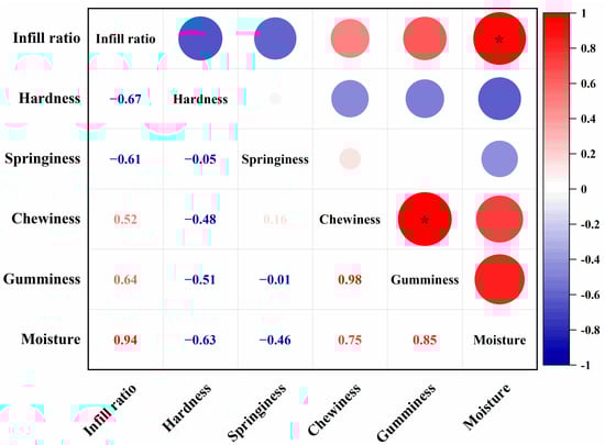 Pearson correlation analysis of the infilling ratio on the texture properties of 3D printed samples (* p < 0.05).
