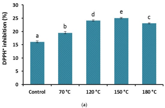Many studies have been engaged in the assessment of the antioxidant activity, including the radical scavenging activity, reducing power, and antioxidant enzyme activity, subsequent to heat treatment. It was pointed out that the thermally processed products displayed elevated chain-breaking and oxygen-scavenging activities [18,19]. Previous studies have reported that the antioxidant properties of garlic [20] and tomato [21] were enhanced as a consequence of thermal treatment due to the disruption of the cell wall and liberation of phenolic compounds from their insoluble forms. The polyphenolic (both free and bound) flavonoids contents and antioxidant activities of Shiitake mushroom showed a significant increase in mushroom extract subsequent to heat treatment of raw materials at 100 and 121 °C for 15 or 30 min [22]. The antioxidant and physicochemical properties of oat grains studied after sand roasting at 280 °C for 15 s have been reported with a significant enhancement [23]. As a result of roasting, a significant increase was observed in the reducing power and the DPPH radical scavenging activity of the roasted oat groats. Similar findings were reported on rice hull where the content of free phenolic acids increased as a result of heat treatment at 80 to 140 °C for 1 to 5 h [24].