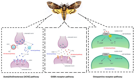 - Jankowska, M.; Rogalska, J.; Wyszkowska, J.; Stankiewicz, M. Molecular Targets for Components of Essential Oils in the Insect Nervous System—A Review. Molecules 2018, 23, 34. [Google Scholar] [CrossRef]