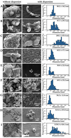 The size distributions and morphology of TD-NPs were determined by SEM with/without dispersion. Comparative study with conventional BP-1 and BP-2 composed of equivalent components to NP-1 and NP-2, respectively, but conventionally produced, was also performed. Counterpart conventional BPs were not available on the market for other TD-NPs. The SEM analysis was carried out at a low voltage of 5–10 kV because most commercially available TD-NP products contain many organic matrices, except NP-7, and these organic matrices are sensitive to irradiation by electrons [34,35,36]. Figure 1 demonstrates that TD-NPs were highly aggregated without any dispersion. More dispersed but still aggregated particles were observed after stirring and sonication in all cases. The average particle sizes of all TD-NPs were less than 100 nm except NP-3, as determined by randomly selecting at least 100 particles from the SEM images. The relatively small constituent particle size of NP-7 consisting of an inorganic matrix was found.