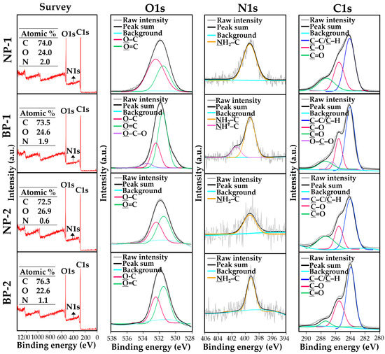 XPS analysis was performed to compare the elemental composition and chemical state of NP-1 and NP-2 with those of conventional BP-1 and BP-2. The spectra survey shows that peaks at 532, 399, and 284 eV correspond to O1s, N1s, and C1s, respectively (Figure 3). Based on these spectra, the chemical compositions (%) of three main elements (O, N, and C) between NP-1 and BP-1 were highly similar, whereas slightly different elemental compositions between NP-2 and BP-2 were found. When spectra of each element were examined, O1s spectra of NP-1, NP-2, and BP-2 were deconvoluted into two peaks attributed to structural bonds of O=C at 531.4 eV and O–C at 532.4 eV, whereas a peak of O–C–O at 533.4 eV, together with O=C and O–C bonds, was determined only in BP-1. Intensity changes in O=C and O–C between NP-1 and BP-1 were also remarkably found, which was not observed between NP-2 and BP-2. The peaks of N1s spectra for NP-1, NP-2, BP-1, and BP-2 correspond to the NH2–C bond at 399.3 eV, and a peak of NH+–C at 401.36 eV was detected only in BP-1. In the case of C1s, the spectra for all samples were commonly deconvoluted into three peaks at 284.1, 285.6, and 287.4 eV, corresponding to C–C/C–H, C–O, and C=O bonds, respectively. Meanwhile, a peak of O–C–O at 286.5 eV was only identified in BP-1. Intensity increases in C–C/C–H and decreases in C=O bonds in BPs compared with NPs were also observed.