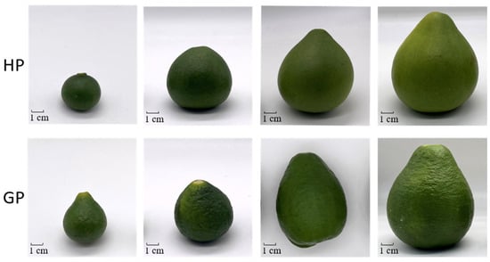 Pictures of pomelo fruit development stages. S1–S4 four sampled stages during fruit development. The upper fruits are “Honey pomelo” (HP) and the down fruits are “Golden pomelo” (GP).