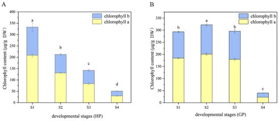 The changes of chlorophyll composition in different periods were shown in Figure 2. It could be found that the content of chlorophyll a was always higher than chlorophyll b in the four-growth process of two pomelo genotypes. In honey pomelo, the total chlorophyll content was the highest (333 ± 17 μg/g DW) at S1, and then decreased significantly to the lowest (51 ± 3 μg/g DW) at the following three stages, only 15.33% of the initial content at S4. The change trends of chlorophyll a and b were similar to that of total chlorophyll. The maximum value of chlorophyll a was 208.77 ± 6.86 μg/g DW at S1, and the minimum value (30 ± 2 μg/g DW) was only 14.25% of the initial value at S4. The maximum value of chlorophyll b was 124.26 ± 19.28 μg/g DW at S1, and the minimum value (21 ± 1 μg/g DW) was only 17.15% of the initial value at S4.