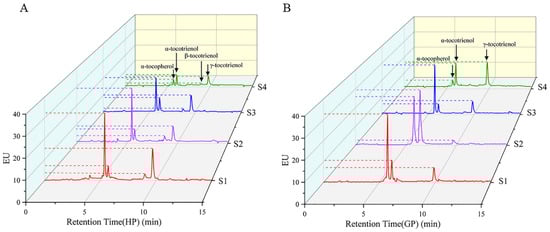 HPLC profiles of tocochromanol in young pomelo fruits. (A) Honey pomelo; (B) Golden pomelo.