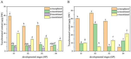 Dynamic changes of tocochromanol during fruit development in the two types of pomelos. (A) Honey pomelo; (B) Golden pomelo. Different letters indicate significant differences between values (p < 0.05).