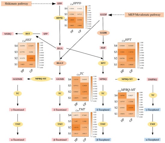 The relative expression levels of selected genes in tocochromanol biosynthesis pathway were shown in Figure 5. Homogentisate phytyl transferase (HPPD) catalyzes HPP to homogentisic acid (HGA), which is the first enzyme in the tocochromanol biosynthesis pathway. The results showed that the encoding gene of HPPD was up-regulated at S2, but significantly down-regulated at S3 and S4 in honey pomelo. In contrast, the expression of CmHPPD in golden pomelo was continuously down-regulated in four periods and significantly down-regulated at S3 and S4. Overall, the expression of CmHPPD was both higher at S1 and S2 stages but lower at the latter two stages. In contrast, the average expression of CmHPPD in honey pomelo was higher than that in golden pomelo.