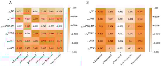 Pearson correlations between tocochromanol (A,B) compositions contents and their gene expression levels. (A) The correlations of honey pomelo. (B) The correlations of golden pomelo.