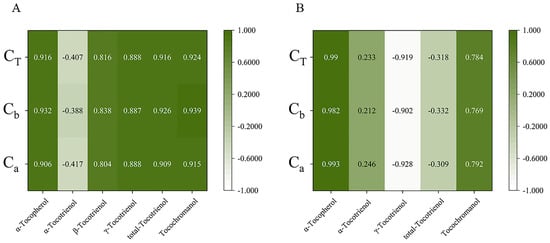 Pearson correlations between tocochromanol (A,B) compositions content and chlorophyll compositions content. (A) The correlations of honey pomelo. (B) The correlations of golden pomelo. CT, total chlorophylls; Cb, chlorophyll b; Ca, chlorophyll a.