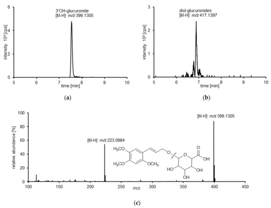 Consequently, incubation of bAE with microsomes resulted in diol-derived glucuronic acid conjugates. The extracted ion chromatograms (XICs) with m/z 399.1297 for 3′OH glucuronide (Figure 2a) and m/z 417.1402 for erythro- and threo-asarone diols-derived glucuronic acid conjugates (Figure 2b) allowed the detection of two peaks with mass differences (∆m) of 0.5 ppm and 0.8 ppm to the calculated masses of [M–H]−. Figure 2c shows the qTOF-MS spectrum of the 3′OH-glucuronide. The fragment with m/z 223.0984 can be assigned to the loss of the glucuronic acid moiety and corresponds to the [M–H]− of 3′OH (Figure 2c). Due to its low concentration, the spectrum of the erythro- and threo-asarone diol-glucuronides did not provide significant fragmentation data. Liver microsomes of human and horse were also used to investigate the phase II metabolism of both phase I metabolites (3′OH, bAE). The respective glucuronic acid conjugates were formed by all species but with slightly different turnover rates (data not shown). Detailed information about species-specific phase II-Metabolism has to be considered in subsequent analyses and are not in the scope of the presented investigations. Sulfuric acid conjugation was not observed at all, indicating that glucuronidation can be considered as the main metabolic phase II pathway in microsomes from all species.