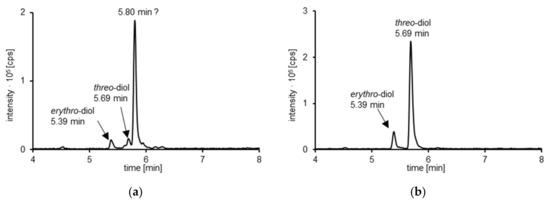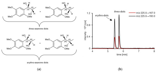 Method validation of the used HPLC-MS/MS method was performed prior to analysis of the urine samples from the human study. As erythro- and threo-asarone diols were found to be the dominant metabolites in urine after beta-glucuronidase treatment, quantitation of these compounds with a matrix-matched calibration in blank urine was performed. Erythro- and threo-asarone diols are diastereomers, which represent a pair of enantiomers, respectively (Figure 3a).