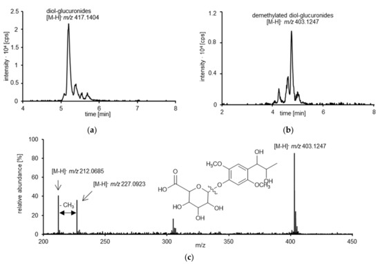 Exemplary HPLC-qTOF-MS chromatograms of a randomly selected urine sample before enzyme treatment. Presented are the extracted-ion chromatogram (XICs) with the calculated mass for (a) erythro- and threo-asarone diol glucuronides (diol-glucuronides, m/z 417.1404 ± 0.02) and (b) demethylated erythro- and threo-asarone diol glucuronides (demethylated diol-glucuronides, m/z 403.1247 ± 0.01). (c) HPLC-qTOF-MS spectrum of the O-demethylated erythro- and threo-asarone diol glucuronides (m/z 403.1247 ± 0.01) with the respective structural formula. The fragment m/z 227.0923 ± 0.02 corresponds to the O-demethylated metabolites after glucuronic acid cleavage. The loss of a further methyl group is shown by the exact mass of m/z 212.0685 ± 0.01.