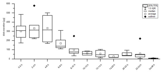 The kinetic curve was determined using point in time of urination (aliquot of each urine delivery of each participant), given urine volume and concentrations of erythro- and threo-asarone diols in the urine samples over the period of 48 h. Time points were classified in two-hour blocks, except for the night hours (14–20 h) and the last 24 h, because in this period only a small number of samples was above the limit of quantitation (LOQ). The results were represented in a box-plot-whisker diagram. The average 50% of the data is located within the box, whose dimensions are defined by the lower and upper quartiles. The lowest and highest data points are shown by the whiskers if the values fall within the 1.5 interquartile range otherwise they are outliers and demonstrated as dots below and above the whiskers.