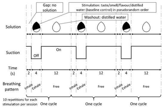 All stimuli and water were delivered at room temperature (23–25 °C) through a tailor-made intraoral device in an original standardised delivery system. The system consisted of an intraoral device connected with separate delivery tubes for different stimulants to avoid cross-contamination [38,44], flow meters to control the flow rate of solution, and a suction apparatus to remove the solutions and saliva induced by taste sequentially and to avoid swallowing. The suction apparatus also removed the smell from the mouth and oropharynx, as demonstrated during the pilot tests. The system was computer-controlled to allow automated solution delivery. The timing of the introduction of the solutions onto the tongue was synchronised with the MRI time series.