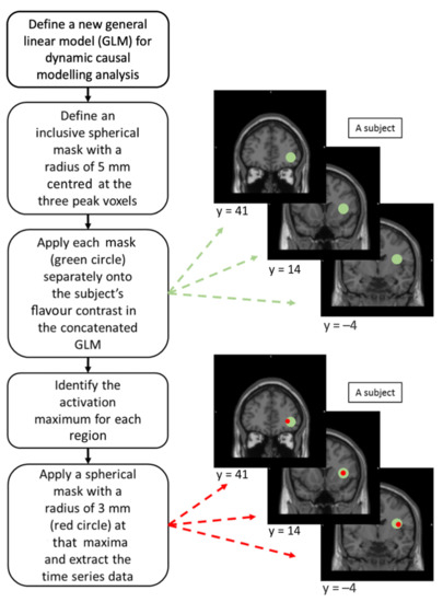 A new GLM was reconstructed for each participant by concatenating the 3 fMRI sessions with modification of session effect, high-pass filter, and autoregressive, AR(1), model to avoid deformation of the time series data [51]. Three spherical inclusive masks with a radius of 5 mm centred at those activation peaks were applied independently on each participant’s flavour contrast in their own concatenated, unthresholded GLM [37,38]. This was to find the maxima within each ROI and to ensure that the maxima among participants were at most 10 mm away from one another [37]. A spherical VOI with a radius of 3 mm was defined at each local maxima, corrected with the effect of interest, to extract the time series data for DCM analysis [51] (Figure 2). The 3 VOIs constituted the model system of the flavour-processing network.