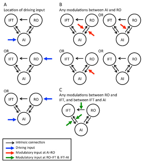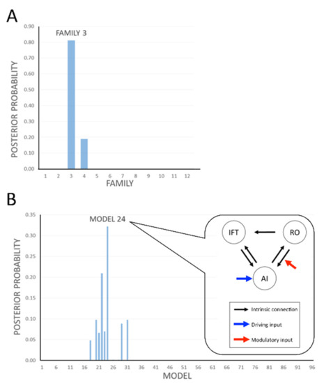 Within Family 3, model 24 (Figure 5B) appeared to be the best model with 33% posterior probability, suggesting modulation in RO to AI only. All remaining models in Family 3 indicated that regardless of other possible variations of modulation possibilities between RO to IFT and/or IFT to/from AI (Figure 3C), modulation from RO to AI remained key (total 81% posterior probability, Figure 5A).
