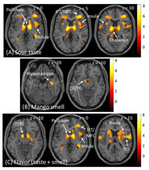 Following oral stimulation by liquid tastants or food, brain activation is commonly observed in the insula, operculum, thalamus, and orbitofrontal cortex (OFC) [1,2,3,4]. Past human brain imaging studies have focused on the responses to sweet, salty, and umami (a savoury taste from glutamate) tastes due to their direct influence on health or their general gustatory preferences. However, sour food is also relevant for human health. For example, lactic acid from sour milk enhances the immune system [5]. Anthocyanin, commonly found in sour cherries or other fruits, is characterised by strong antioxidant and anti-inflammatory properties [6,7]. Experiments on rats and macaque monkeys have demonstrated the activation of the gustatory cortex (the insula) and prefrontal cortex by pure sour taste [8,9]. Meanwhile, human neuroimaging studies usually focused on beer and wine, acidic beverages with bitterness [10,11,12]. However, few studies have examined brain activation by sour tastants. In a positron-emission tomography (PET) study with 10 participants, Small et al. [13] observed that the cortical representation of sour taste was mainly concentrated in the frontal cortex. A functional magnetic resonance imaging (fMRI) study with six participants by Schoenfeld et al. [14] observed activation in the ventral insula. Another fMRI study with 18 participants by Haase et al. [15] observed activation mainly in the frontal cortex, insula, thalamus, and caudate. Crouzet et al. [16] reported neural responses associated with sour taste from 16 participants at the superior temporal gyrus and frontal operculum by electroencephalography (EEG). The latest fMRI studies reported that the multivoxel activation patterns in the insula, thalamus and other regions could reliably discriminate between sour and other tastes (18 participants) [17] and that the discriminating activation patterns between different taste qualities in the insula were also affected by taste intensities (24 participants) [18]. These studies recruited between 6 and 24 participants, but recent neuroimaging guidelines have suggested that a sample size of approximately 30 participants is required for adequate power and to account for inter-subject variability [19,20,21]. Therefore, fMRI studies with a larger sample size (>30) would produce more representative data for the processing of sour taste, and enable an expansion of our knowledge about flavour, that is, the interaction of sour taste with congruent smell in the human brain.