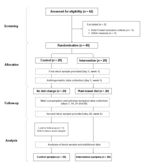 At this point, participants received two gut microbiota test kits (Atlas Biomed, UK []) with detailed instructions on how to collect the samples in the convenience of their own home. The first stool sample was collected and returned by all participants before the intervention started, and the other stool sample was collected and returned by all participants at the end of the 4-week intervention period (on day 28). Participants in the intervention group provided consumption data and side effect/adverse symptom data at the end of each of the 4 weeks to the researcher managing the interventions and participants. A flow diagram of the study can be seen in Figure 1. Comprehensive anthropometrics, meal consumption data and self-reported side effects per week are available in separate files in the Supplementary Materials section.