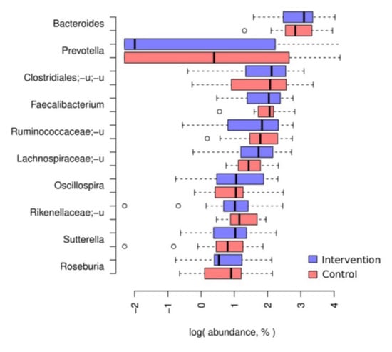 Major taxa. Boxplots detailing the distribution of relative abundance for the 10 most abundant genera; for appropriate display on a log scale, zero values were replaced with a pseudocount (0.1%). In addition, boxplots detailing the distribution of relative abundance for the 25 most abundant taxa in each taxonomic rank at baseline are available in the Supplementary Materials section.